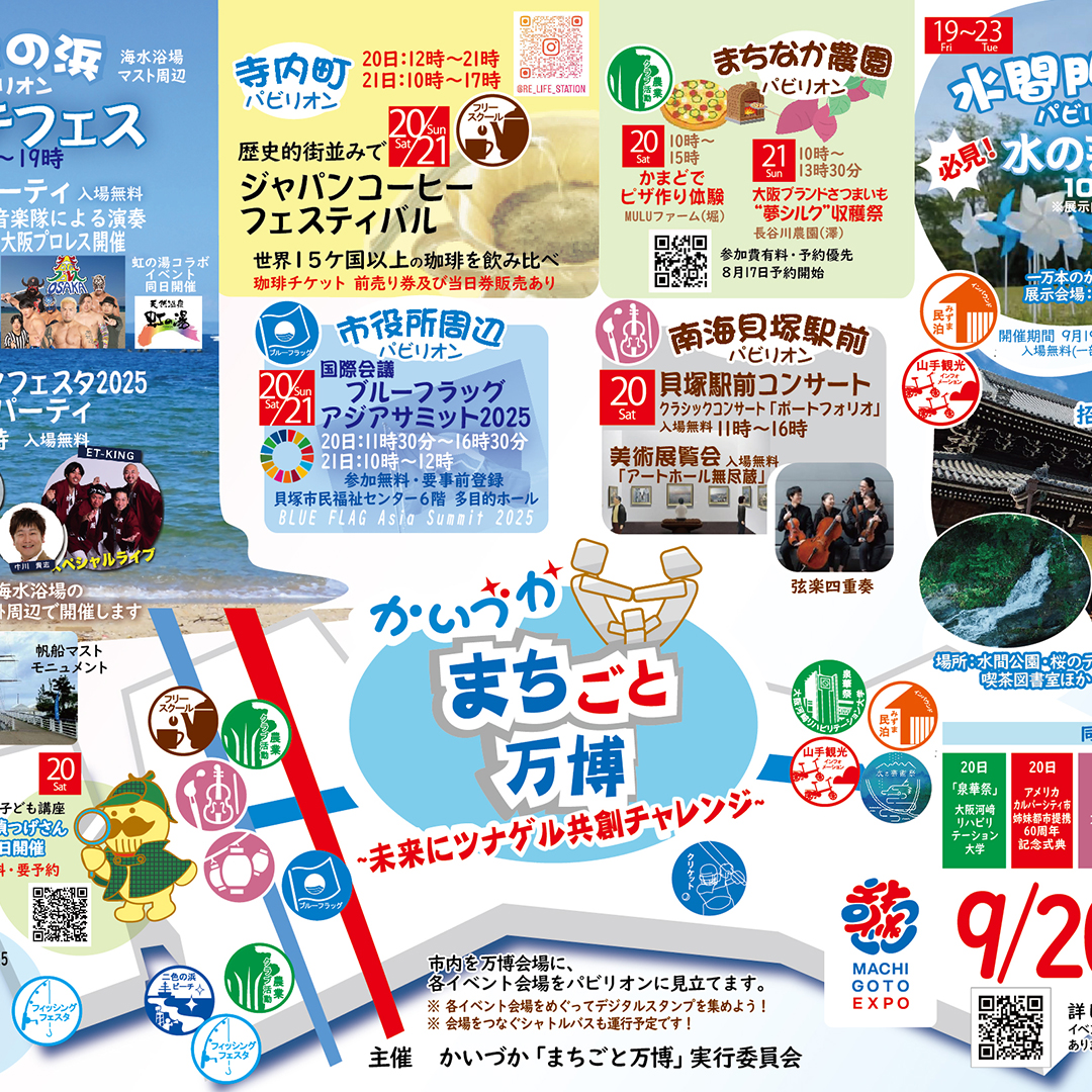 共創チャレンジ でツナガル かいづかの 未来社会 へ 「かいづかまちごと万博」は、2025年の大阪・関西万博を契機に、貝塚市の魅力を高め、市民全体で盛り上がることを目標に生まれたプロジェクトです。大阪・関西万博開催に合わ … 続きを読む かいづかまちごと万博